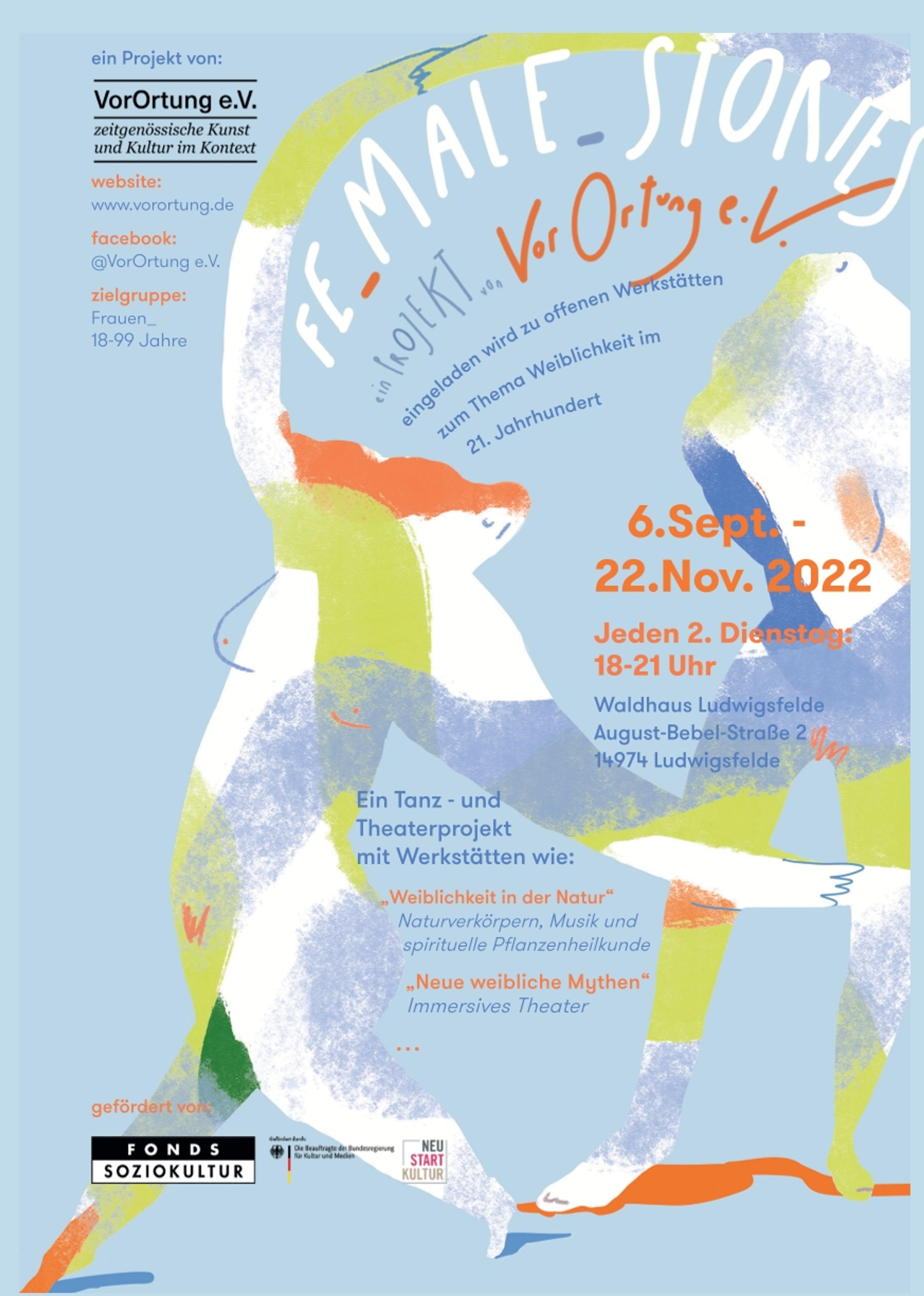 Im Herbst 2022 fand das erfolgreiche Theater- und Tanzprojekt FE_MALE_STORIES zum Thema „Weiblichkeit im 21. Jahrhundert“ im Waldhaus Ludwigsfelde statt. Über mehrere Wochen hinweg kamen Frauen und Personen, die sich als Frauen identifizieren, aus Ludwigsfelde und Umgebung zusammen, um gemeinsam kreativ zu arbeiten und neue Ausdrucksformen von Weiblichkeit zu entdecken.