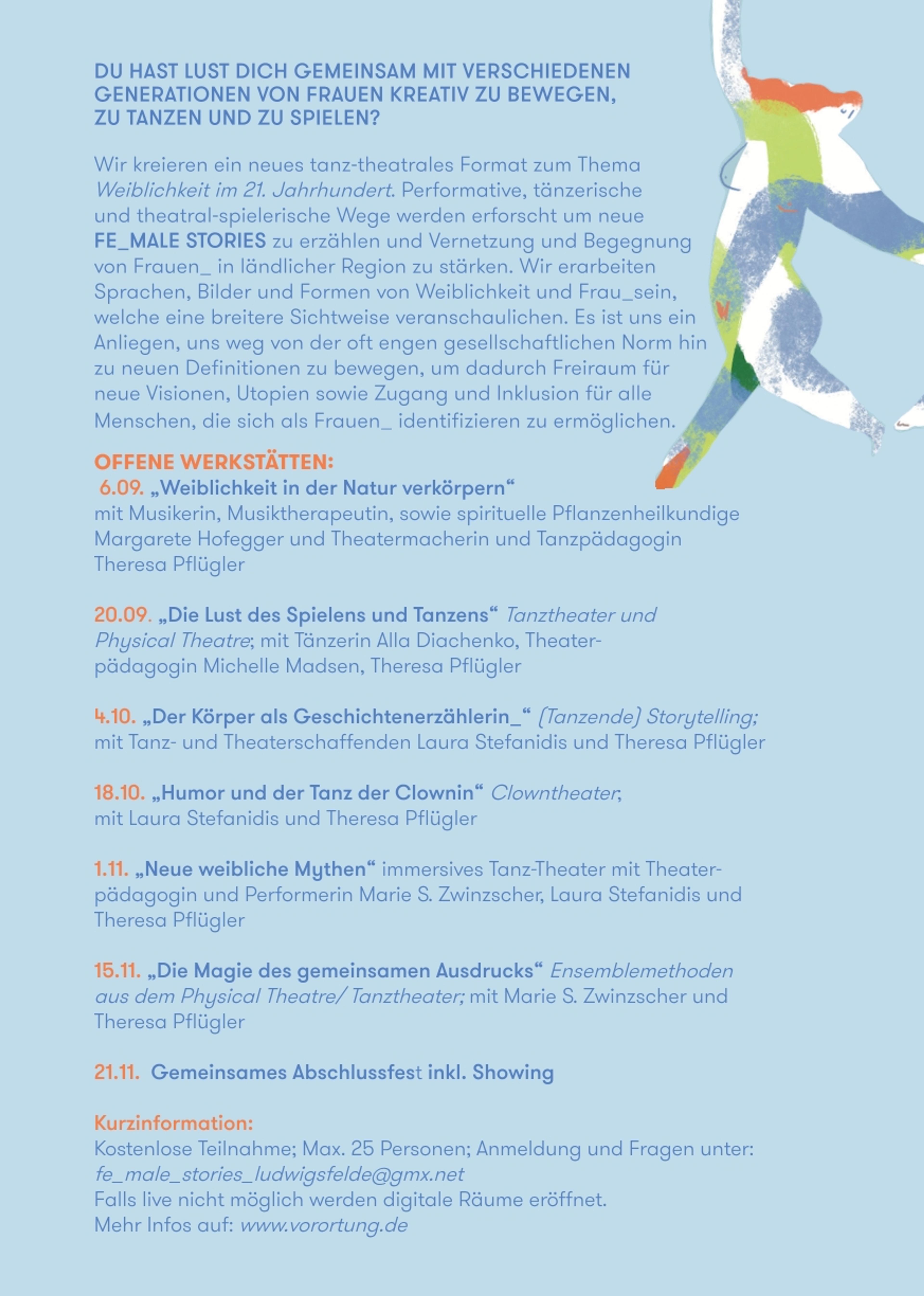 Unter der Leitung der Theatermacherin und Tanzpädagogin Theresa Pflügler sowie eines Teams von Künstlerinnen und Pädagoginnen wurden insgesamt sieben Werkstätten angeboten. Die Teilnehmerinnen hatten die Möglichkeit, sich in einem geschützten Raum kreativ zu bewegen, zu tanzen und zu spielen. Jede der Veranstaltungen war thematisch unterschiedlich und bot vielfältige Einblicke in das Thema Weiblichkeit: